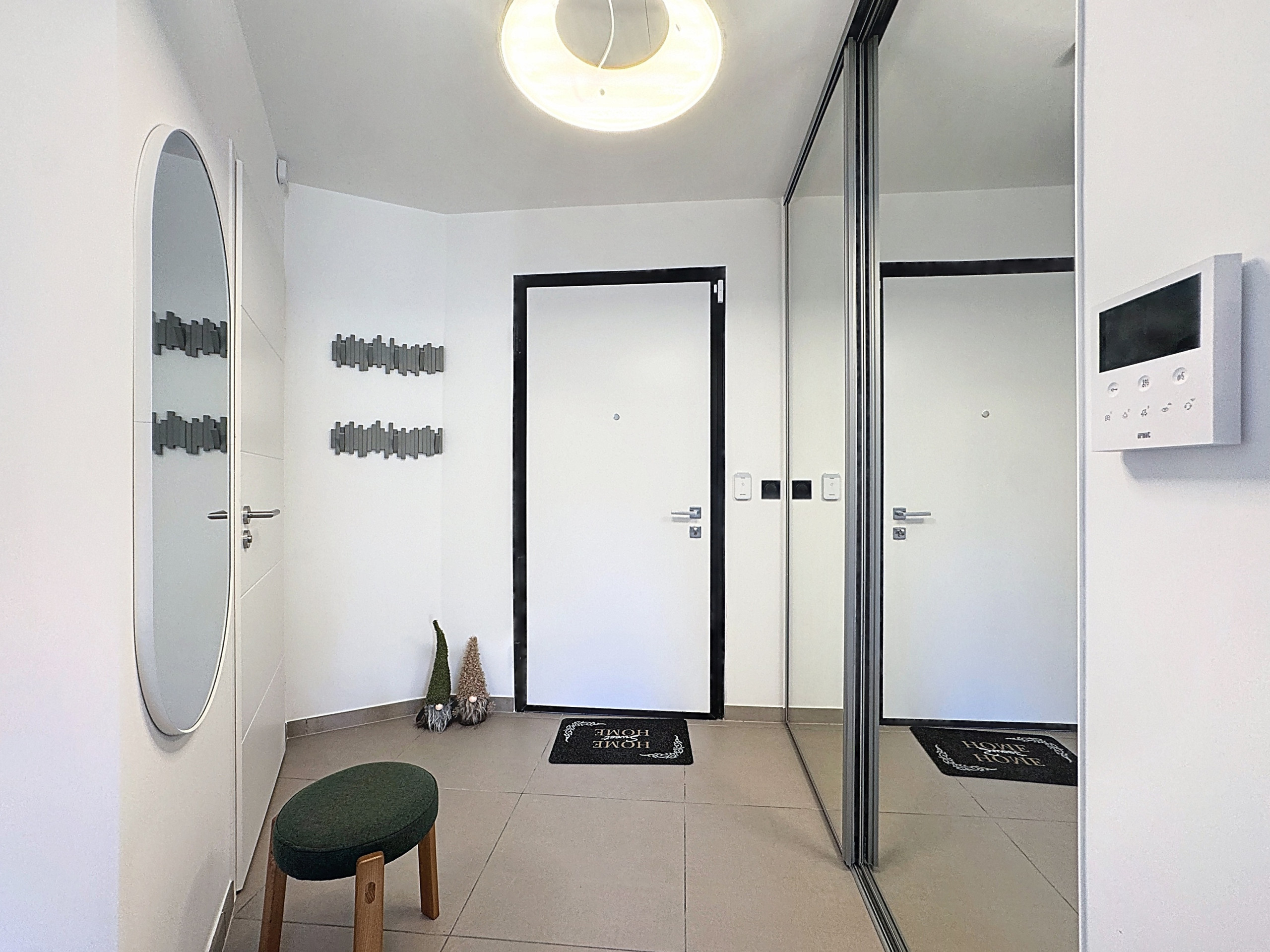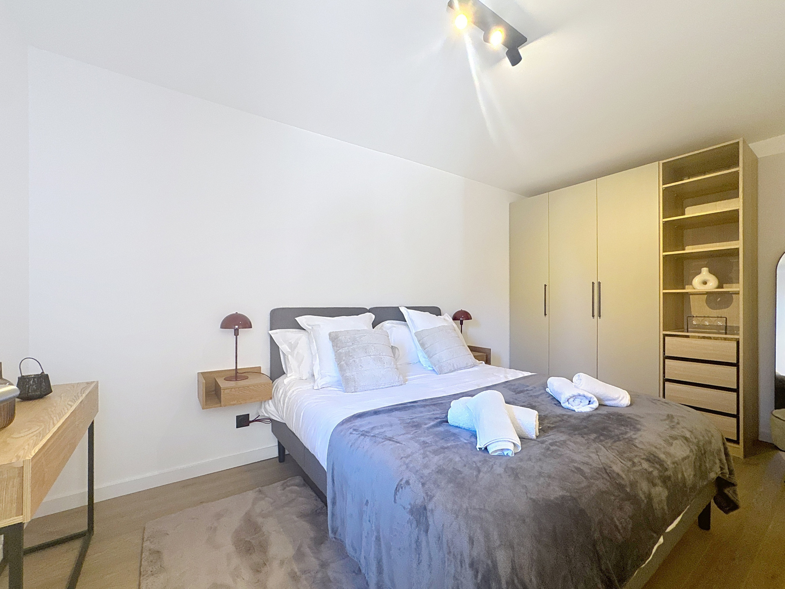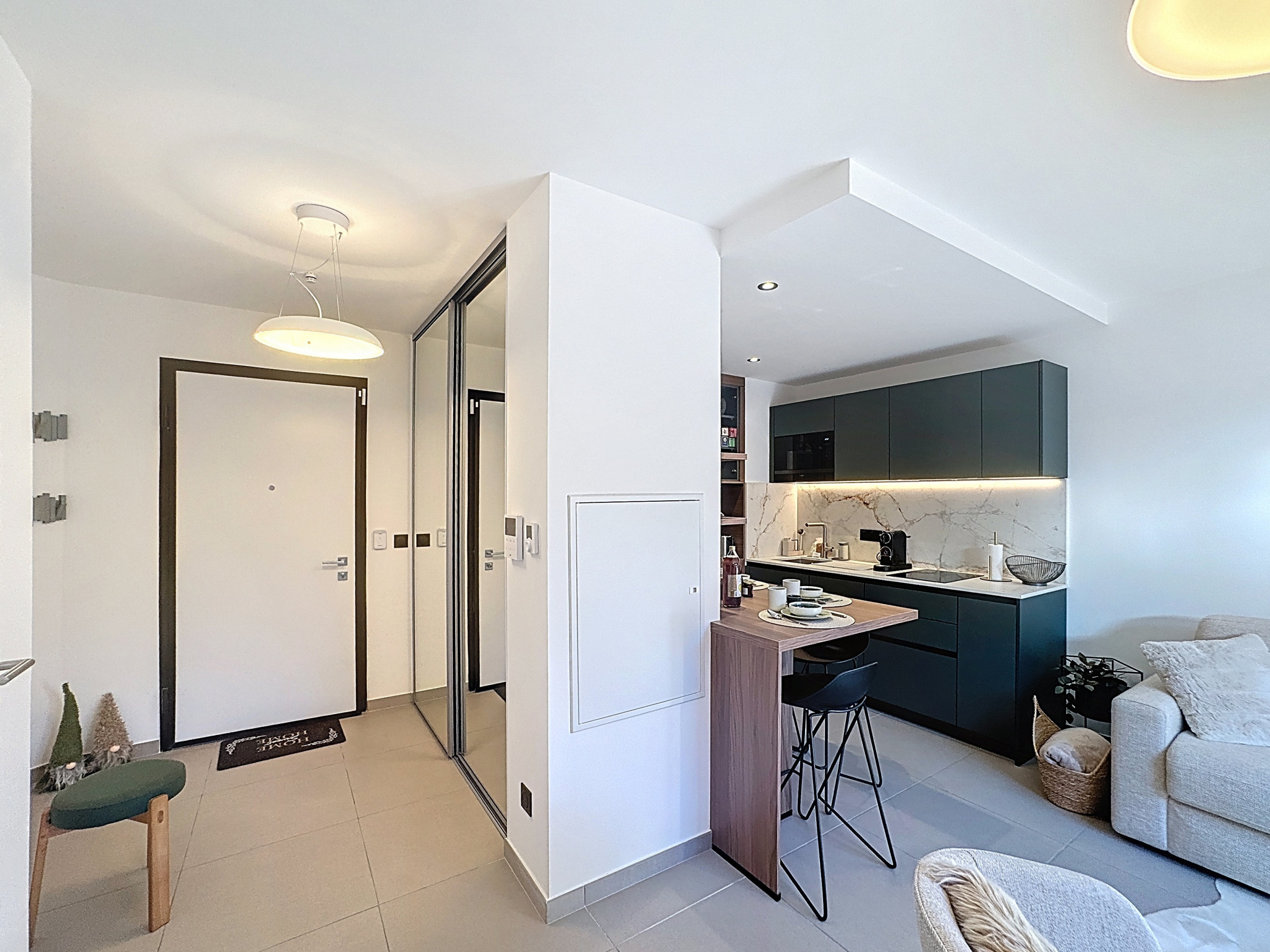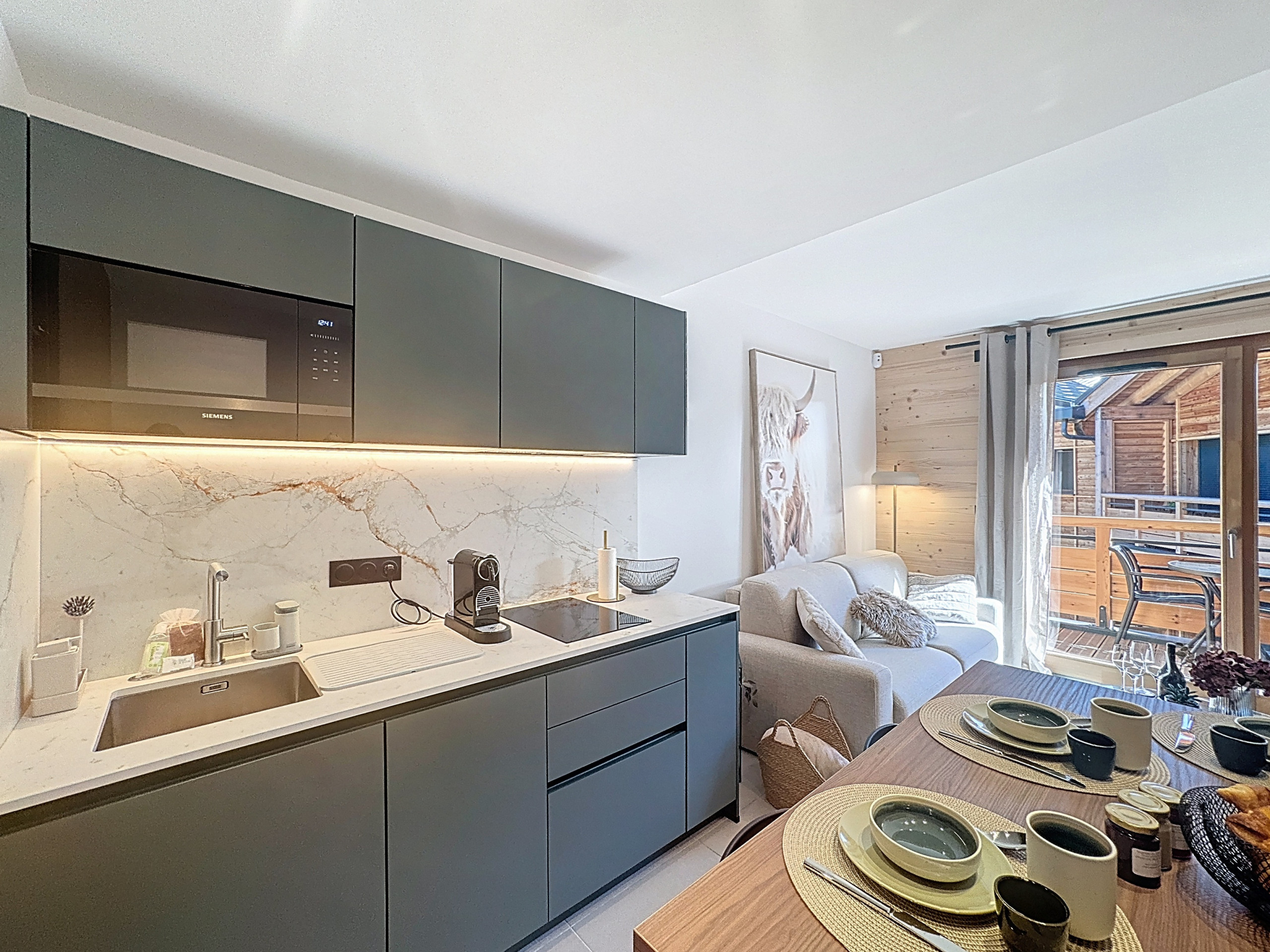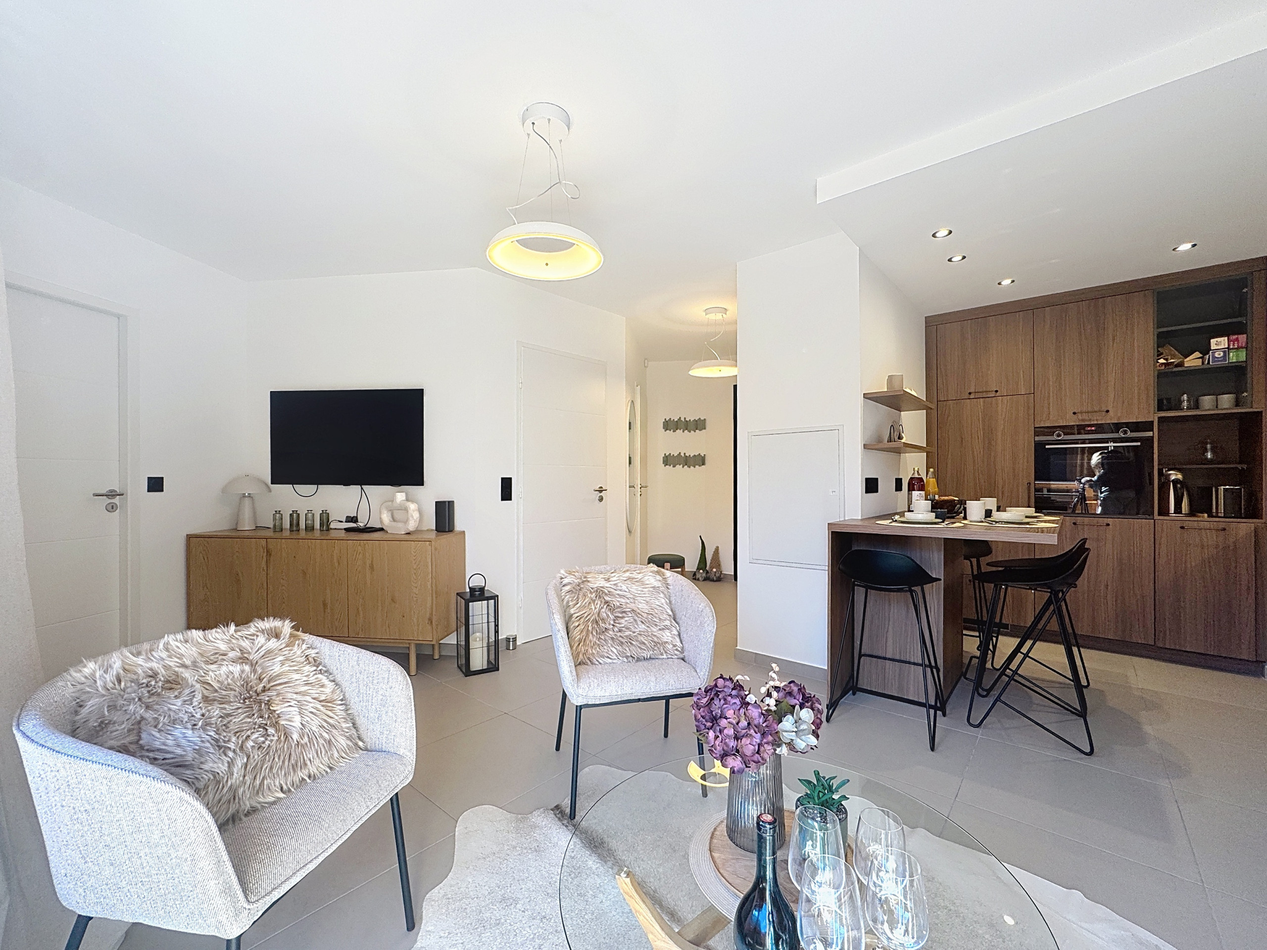 The interior has been carefully designed for your comfort, with a fully equipped kitchen including a refrigerator, oven, dishwasher, Nespresso coffee machine and all the necessary utensils for cooking. You will also find the washing machine and dryer in the kitchen. The living area is bright and welcoming, perfect for relaxing after a day of activities.