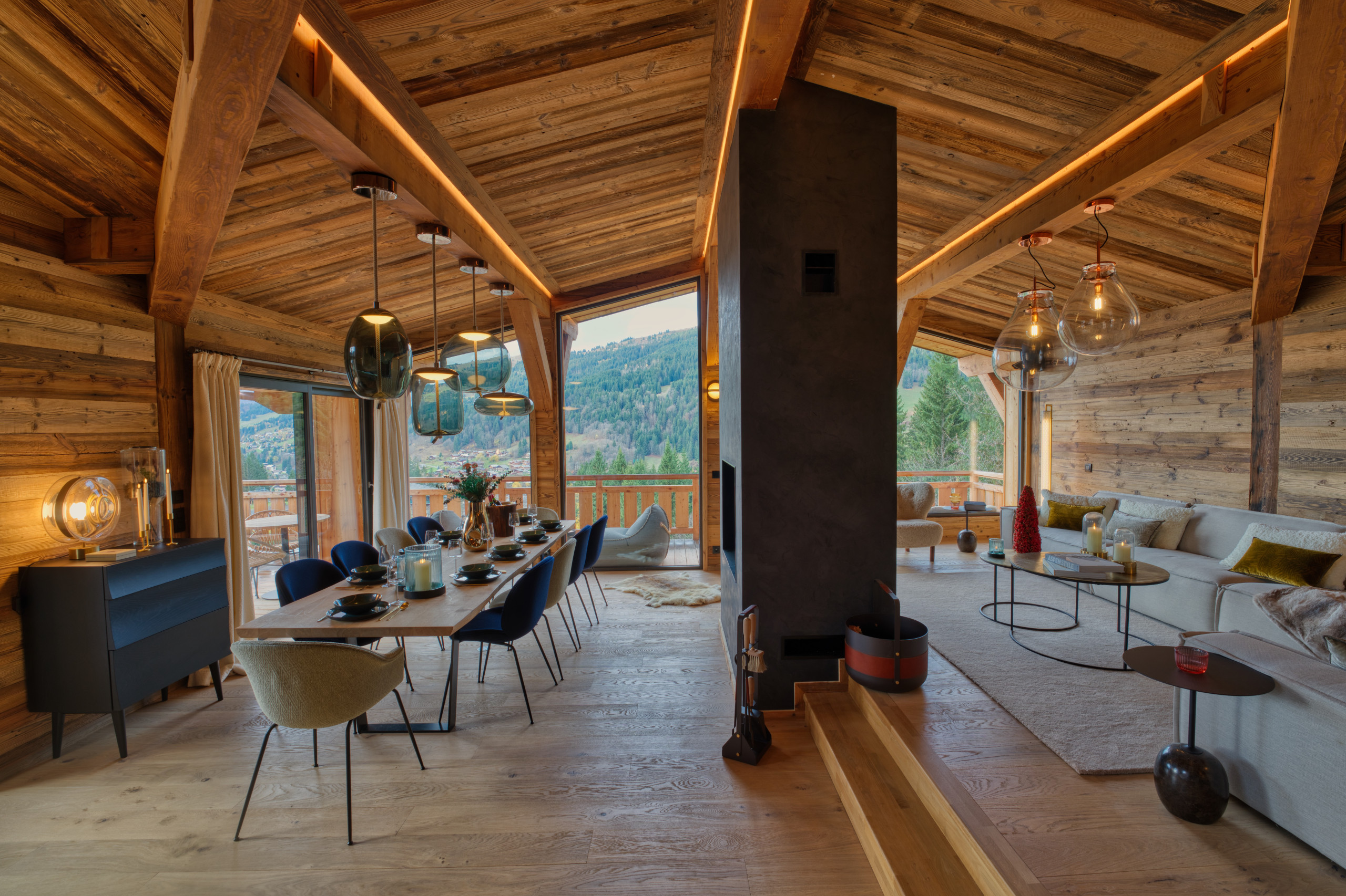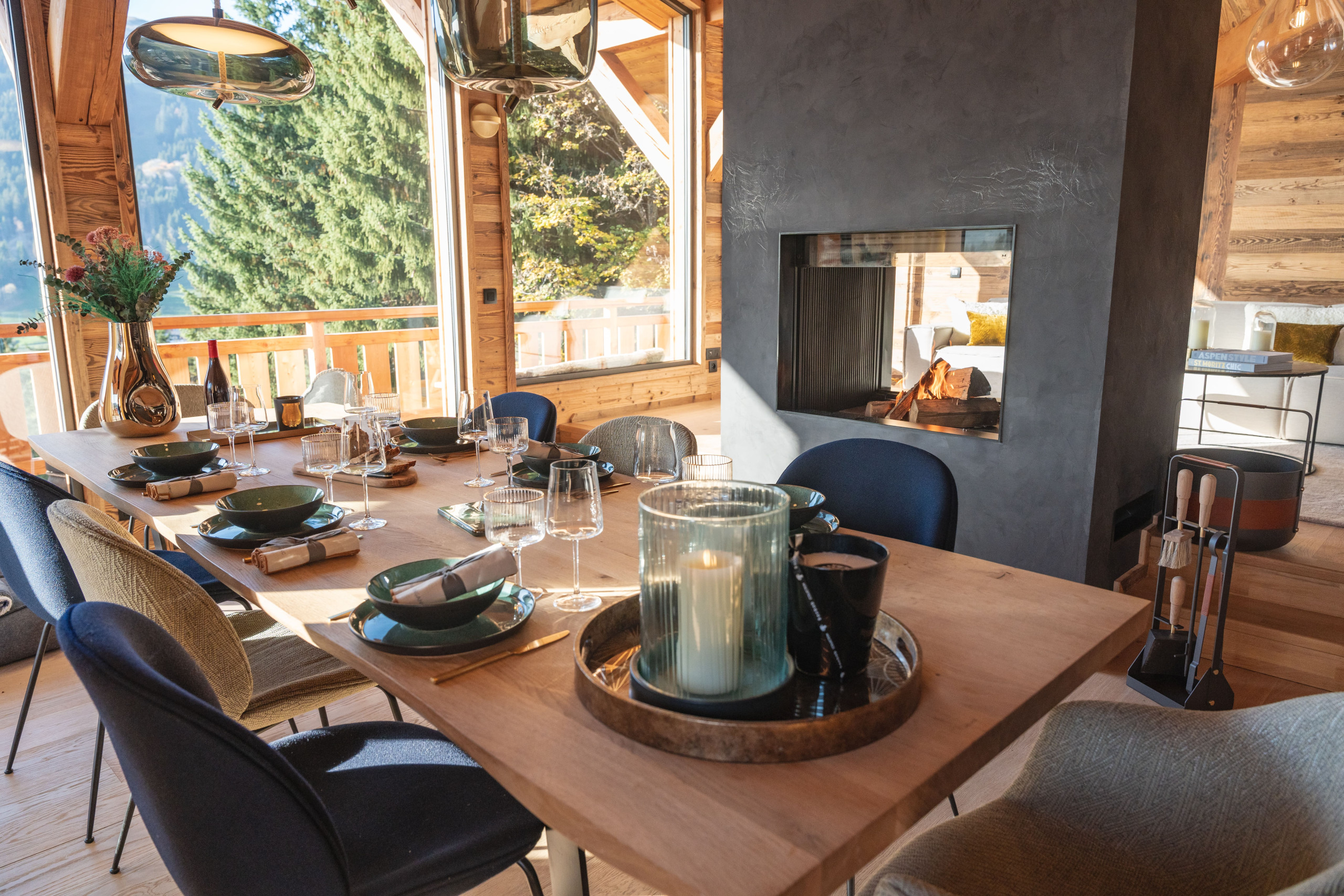The chalet also has a ski room with boot warmers, a fully equipped open kitchen, a spacious living room with a large table for 10 guests and a central fireplace.