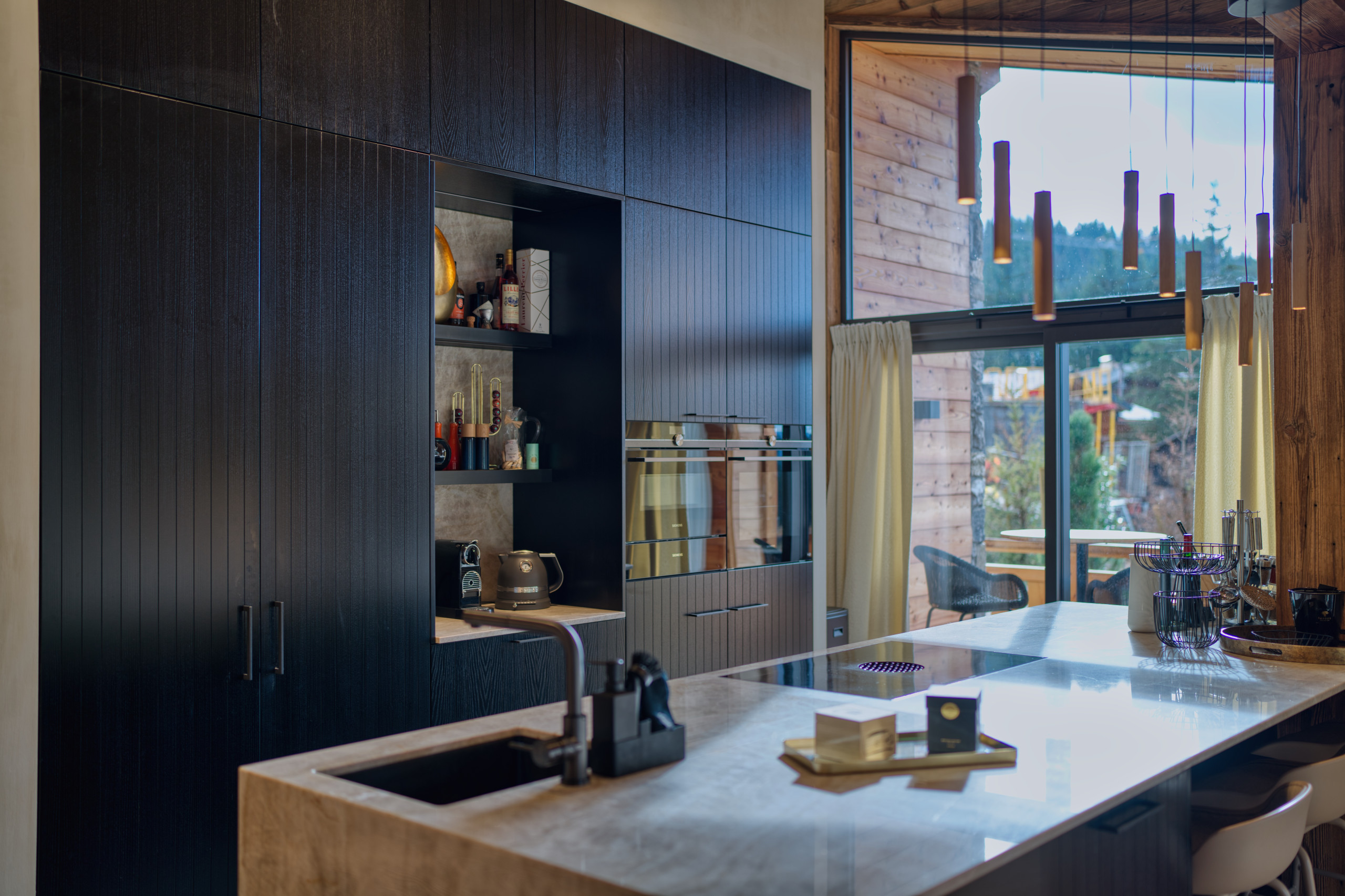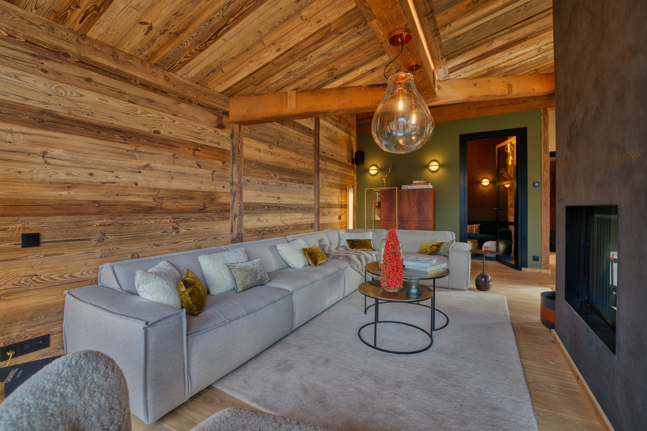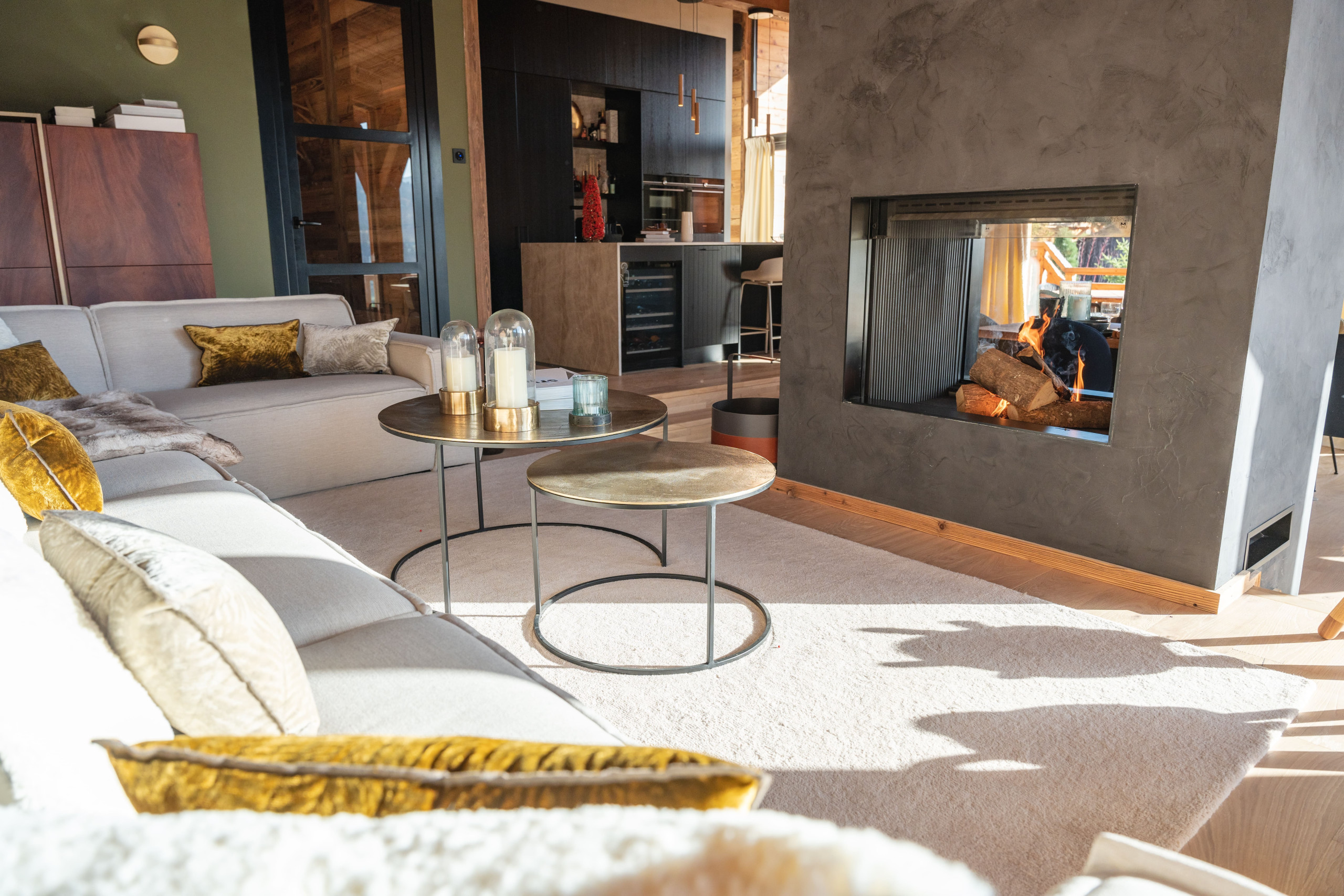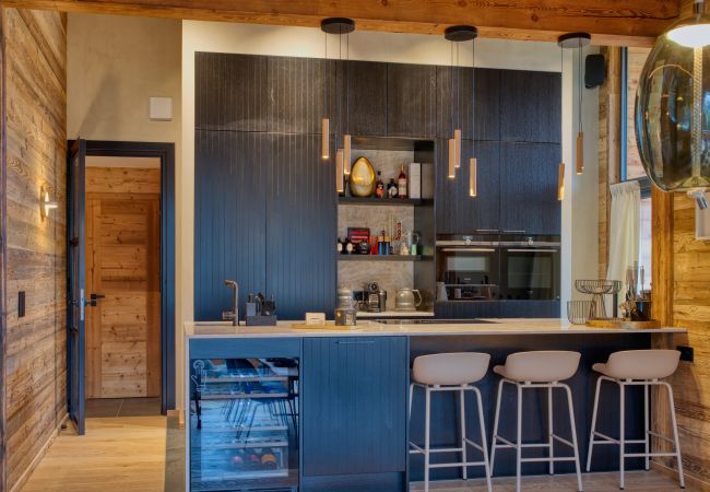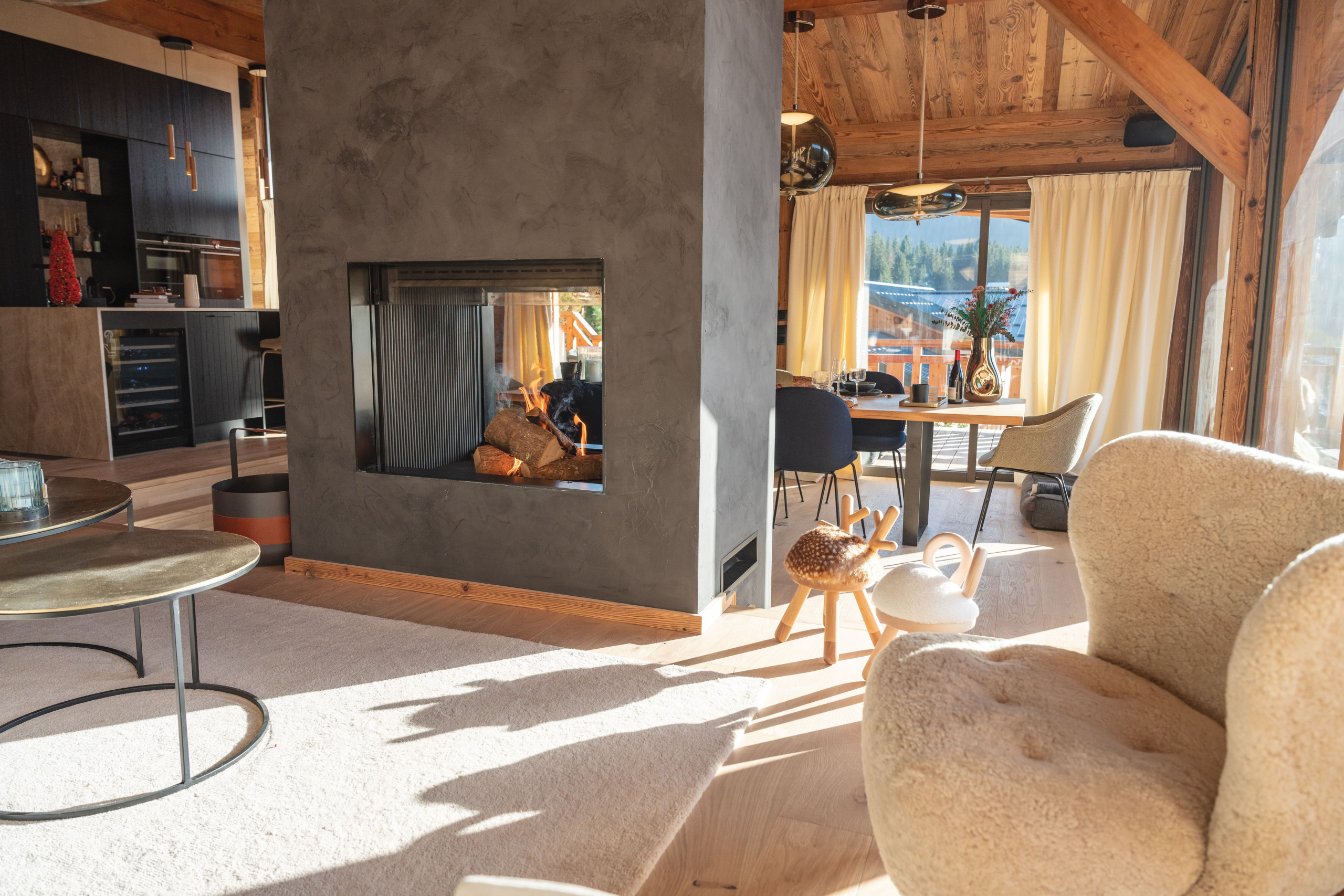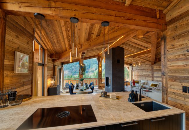 The living space, warm and welcoming, revolves around a living-dining room with a refined alpine decor, blending noble wood, warm fabrics and contemporary touches. The fireplace creates a soft and soothing atmosphere after a day on the slopes. The modern, open and fully equipped kitchen allows for sharing gourmet moments around the large dining table, while the sound system completes the hushed ambiance of the place.