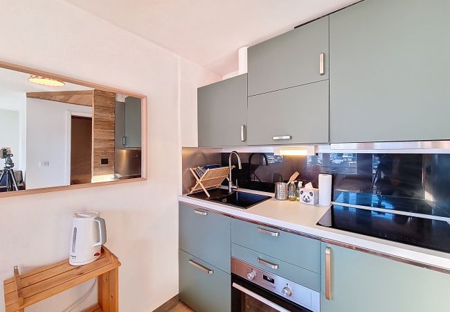 L'appartement dispose d'un balcon, offrant une vue imprenable sur les pentes enneigées. Avec ses deux lits superposés, et un canapé-lit double, il peut accueillir confortablement jusqu'à quatre personnes.