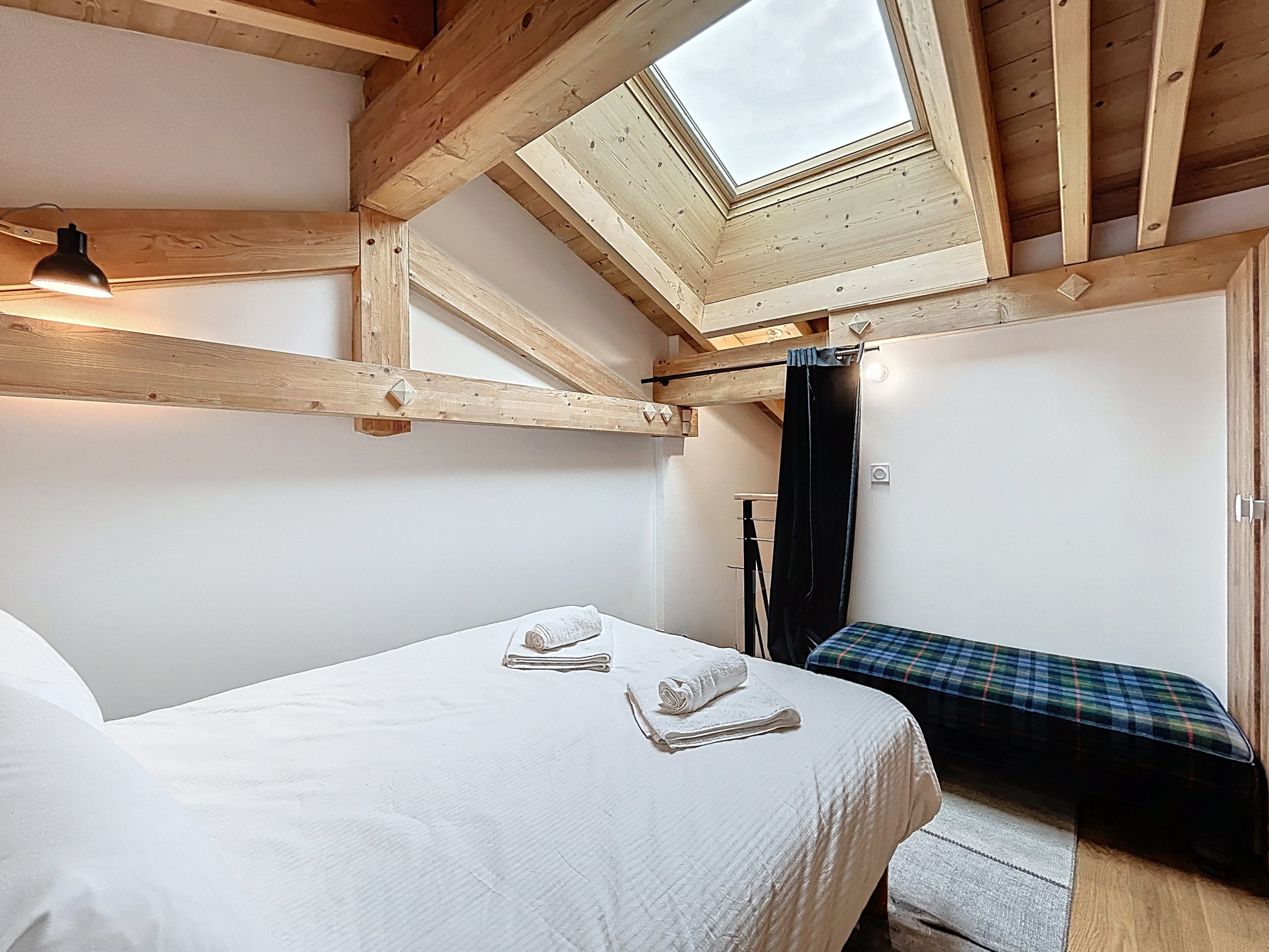 L'appartement dispose d'un balcon, offrant une vue imprenable sur les pentes enneigées. Avec ses deux lits superposés, et un canapé-lit double, il peut accueillir confortablement jusqu'à quatre personnes.