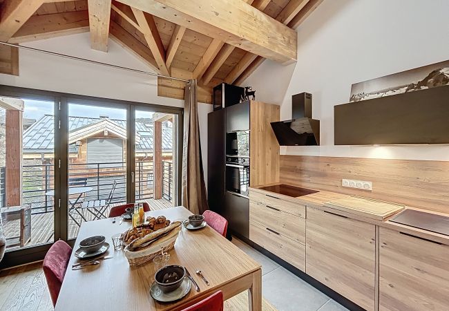 Appartement 2 chambres - Les Gets - Proche centre Cet appartement aux Gets, situé à deux pas du centre, offre un espace de 53 m² idéal pour accueillir jusqu'à 4 personnes. Faisant partie d'une résidence neuve, il bénéficie de prestations modernes et soignées. Entièrement meublé et décoré avec goût, il allie confort et fonctionnalité. La pièce de vie principale est lumineuse, ouverte sur une cuisine moderne entièrement équipée (four, plaques, réfrigérateur, lave-vaisselle, etc.) et un espace salle à manger convivial. Le salon, agrémenté de canapés confortables et d'une télévision écran plat, s’ouvre sur un balcon avec vue sur les montagnes. La salle d’eau moderne est équipée d’une douche à l'italienne. Un casier à skis est à disposition dans la résidence, facilitant les séjours hivernaux. Avec sa proximité immédiate du centre des Gets et des remontées mécaniques, cet appartement est le pied-à-terre idéal pour profiter de la montagne en toute saison.