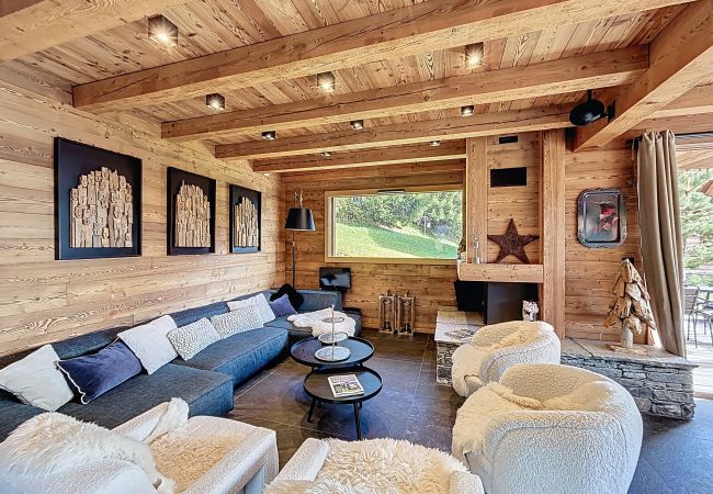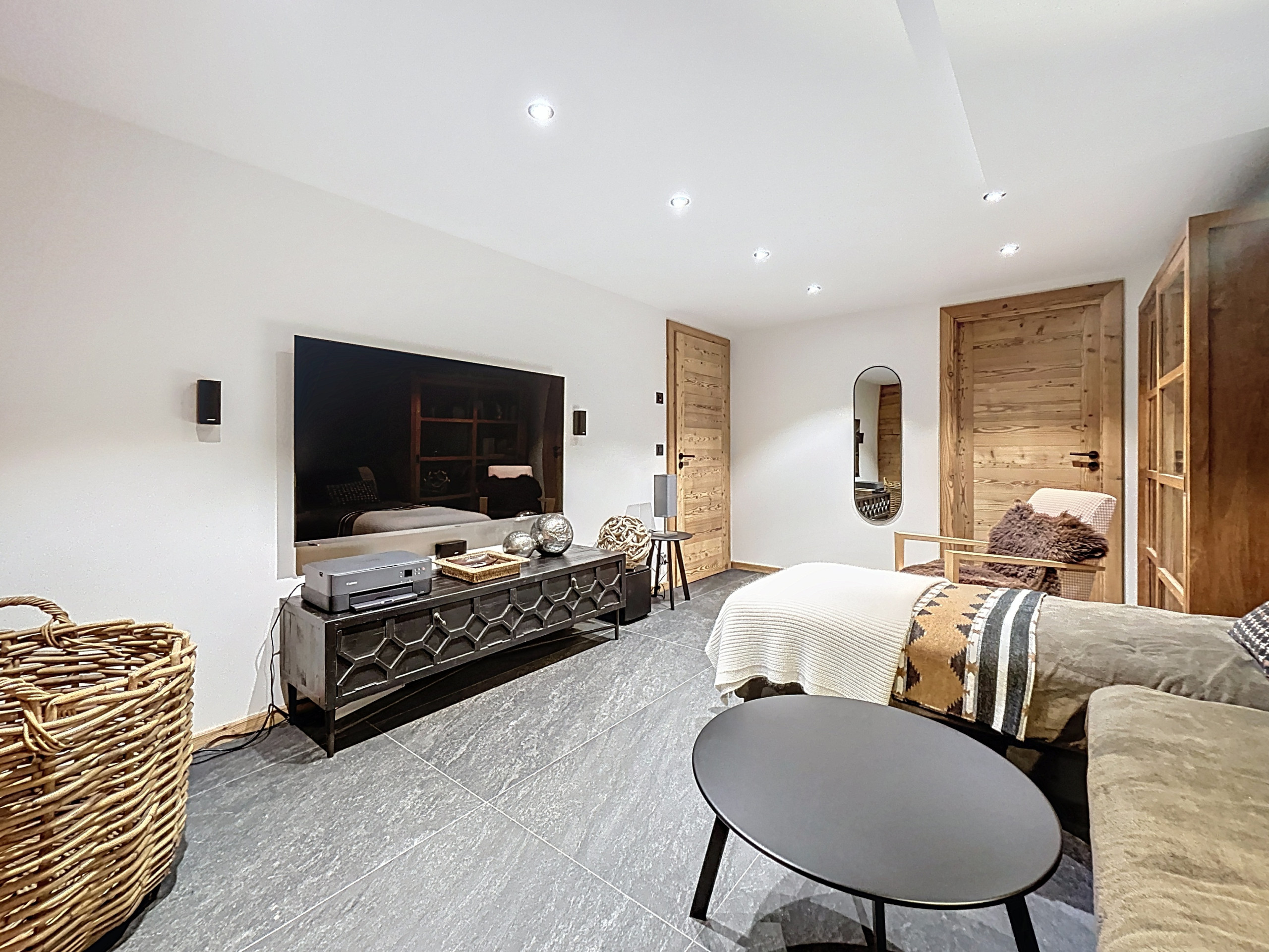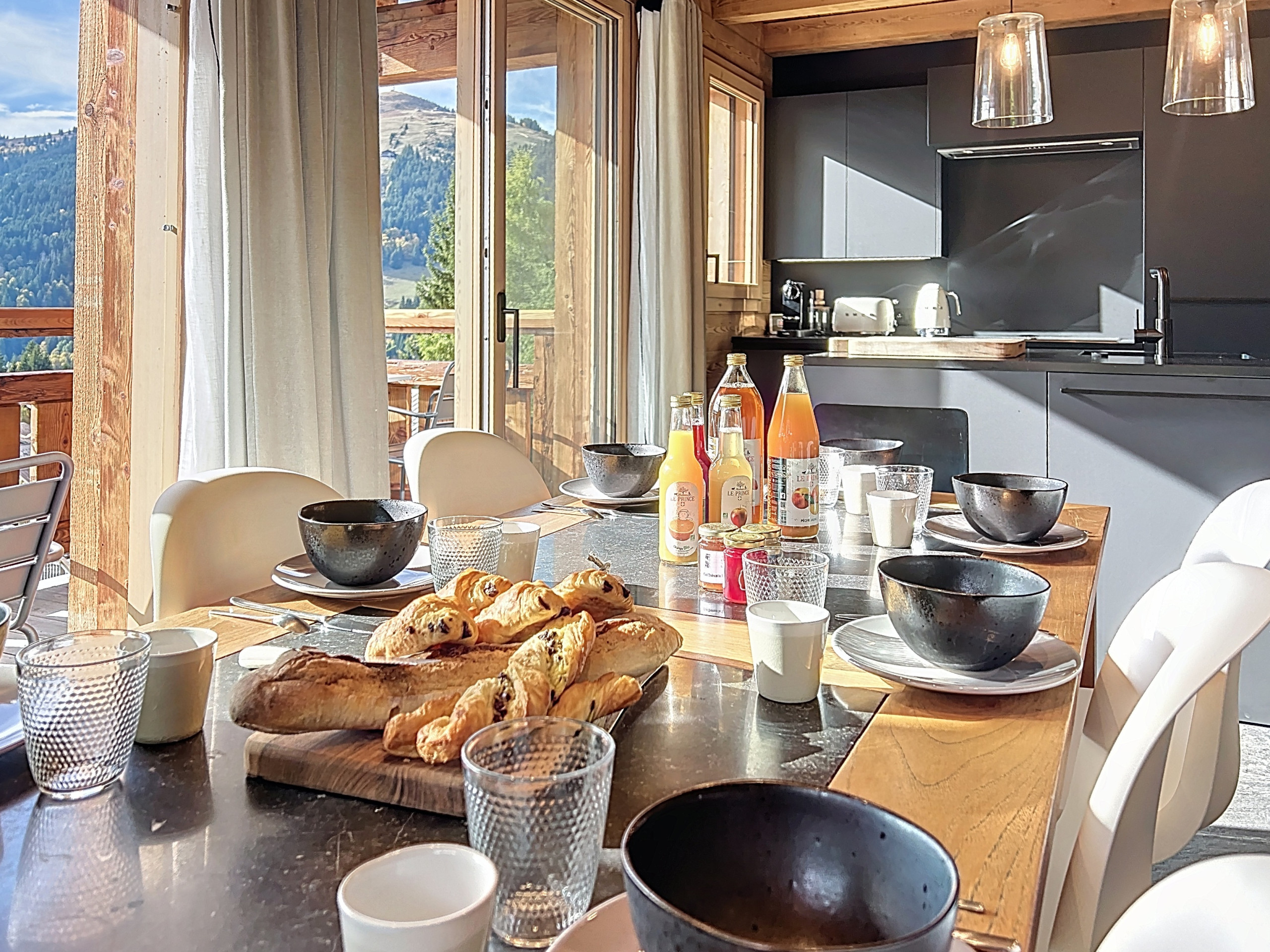L’espace de vie, chaleureux et convivial, s’articule autour d’un salon-séjour à la décoration alpine raffinée, mêlant bois noble, tissus chaleureux et touches contemporaines. La cheminée crée une atmosphère douce et apaisante après une journée sur les pistes. La cuisine moderne, ouverte et entièrement équipée, permet de partager des moments gourmands autour de la grande table à manger, tandis que le système sonore complète l’ambiance feutrée du lieu.