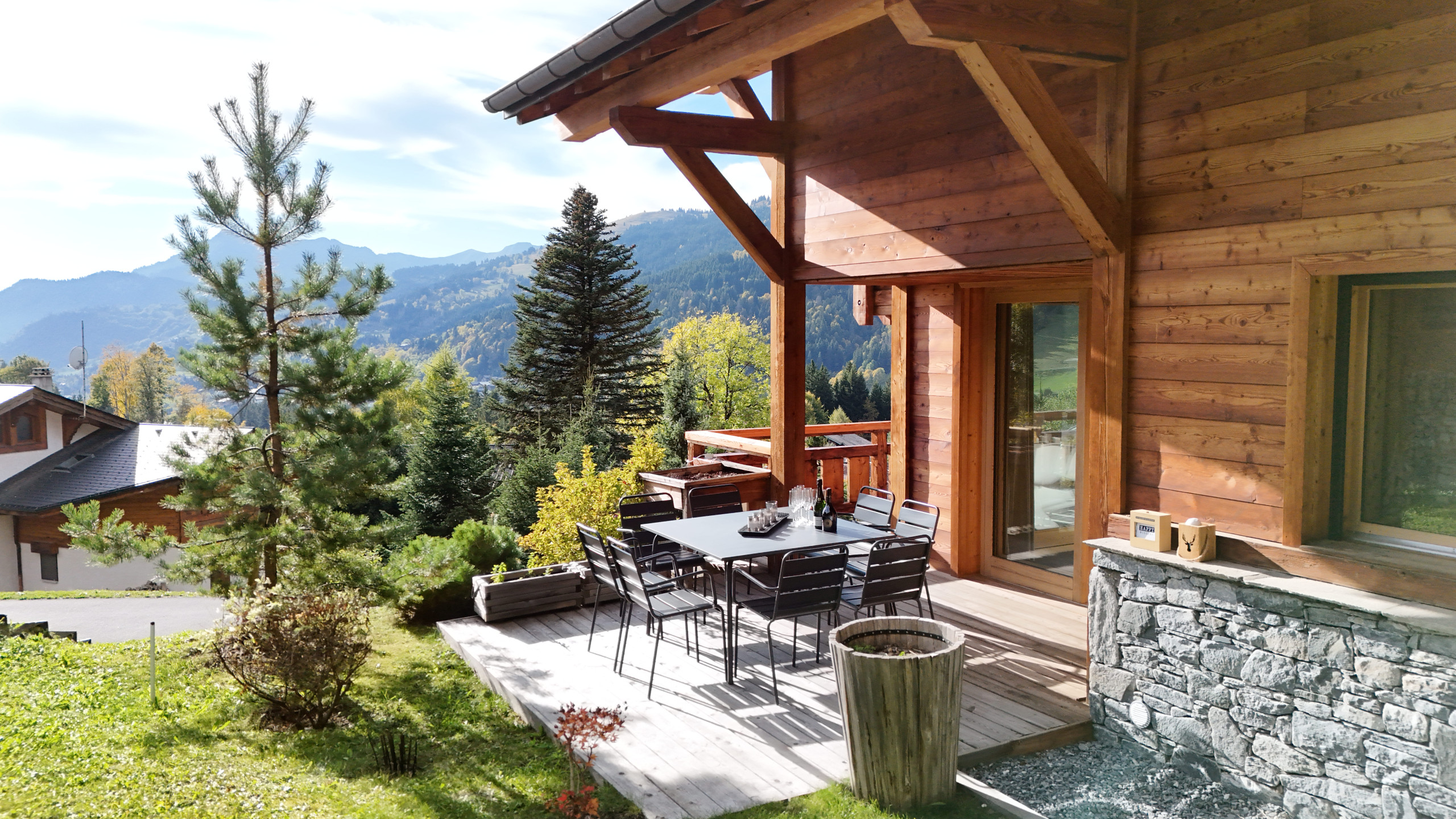 En extérieur, profitez pleinement de la terrasse pour partager vos repas. En contre-bas, détendez-vous et profitez du jardin privé équipée d'un jacuzzi et d'un sauna construit à l'intérieur d'une maison typique montagnarde, appelé "mazot".