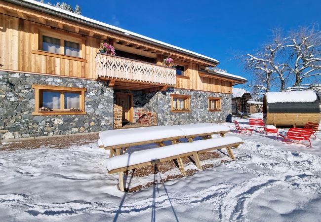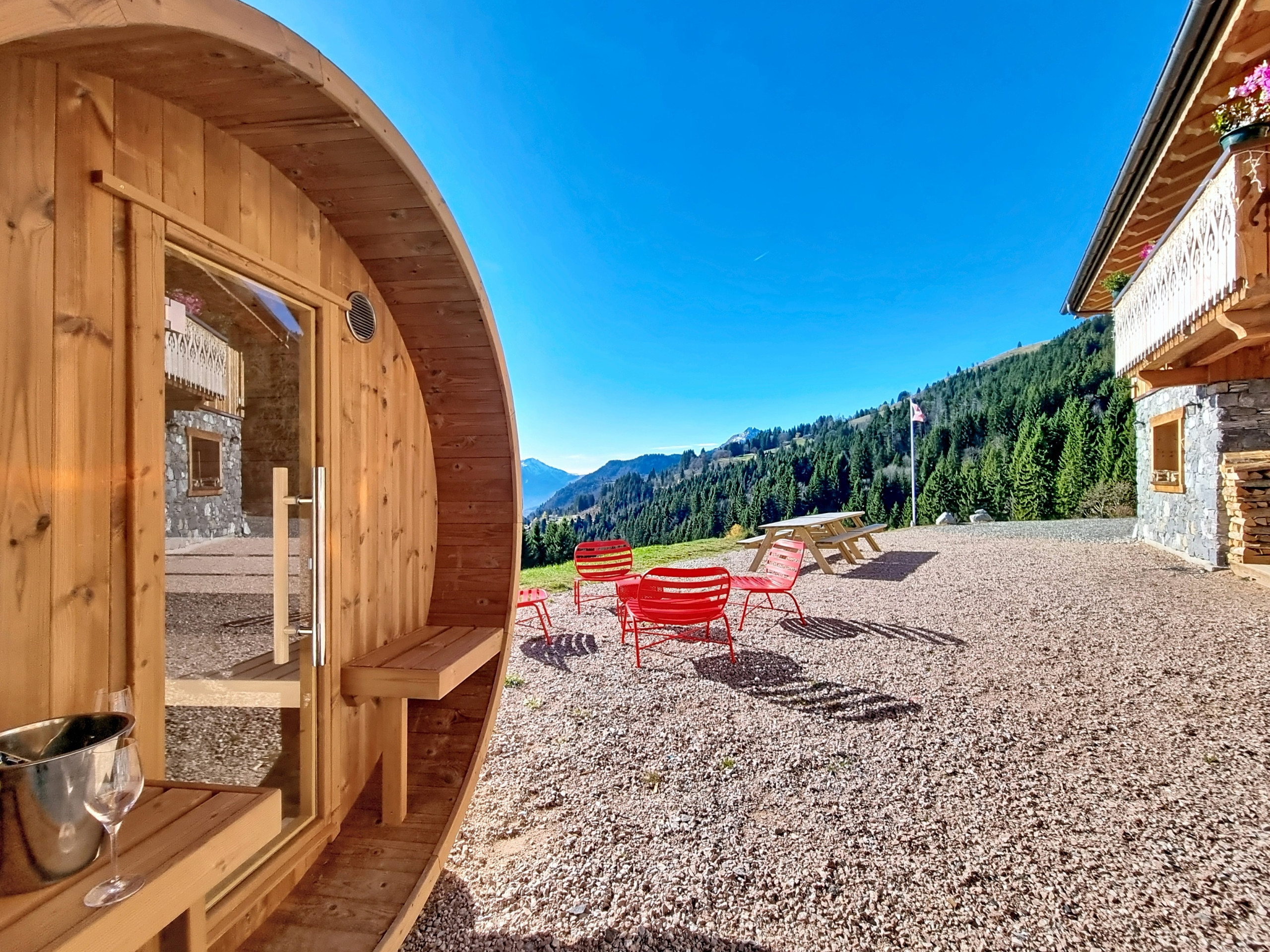 Construit en bois et en pierre, le chalet offre une ambiance cosy et typiquement alpine, parfaite pour se retrouver en famille ou entre amis après une journée sur les pistes. Pour prolonger ces moments de détente, vous pourrez également profiter d’un sauna tonneau extérieur, pouvant accueillir jusqu’à 6 personnes, installé au cœur du jardin pour une expérience bien-être unique face aux montagnes.